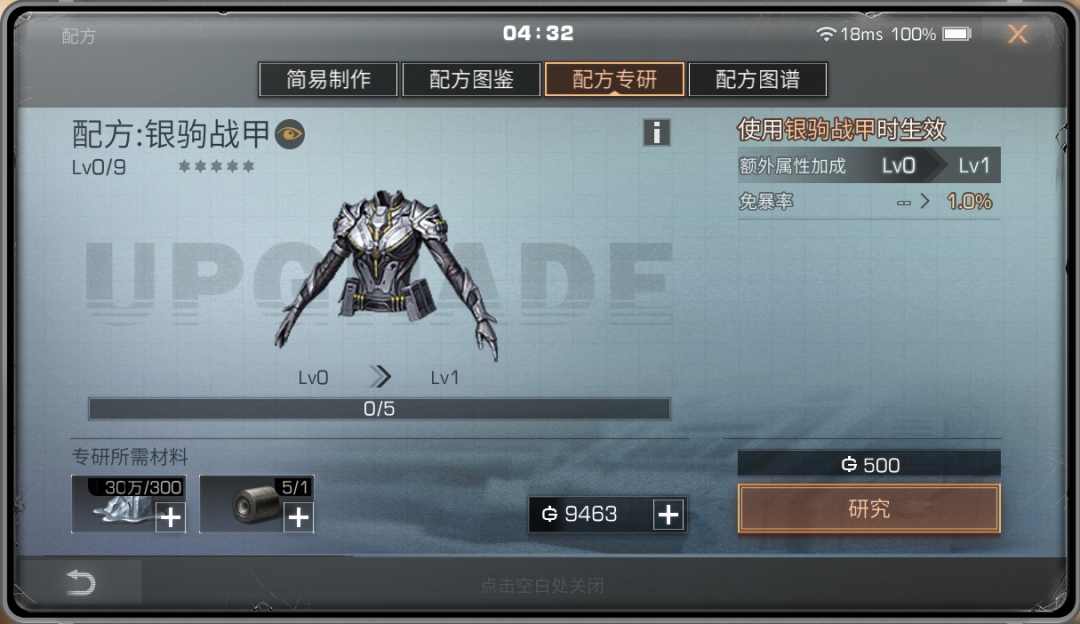 配方专研中对纳米的消耗最大,随着等级提升,纳米材料I,与纳米材料II的消耗数量也会提升。