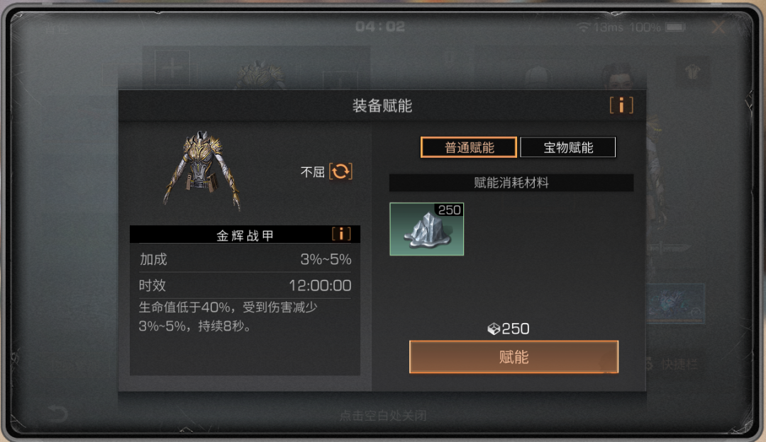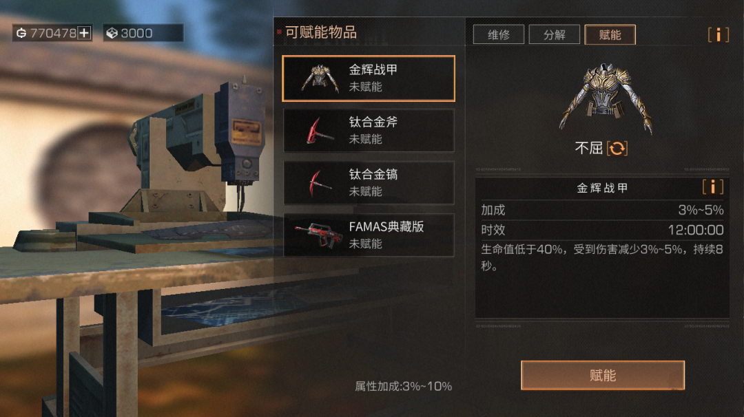幸存者们在家用修理台或背包中点击装备进行赋能时,每次普通赋能将消耗对应的纳米塑材数量,装备赋能可以给武器和护甲附加持续一定时间的特殊效果。