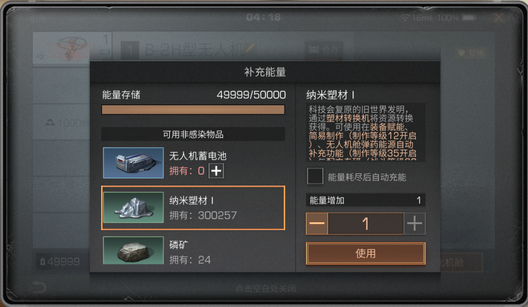 无人机机舱存储了无人机使用所需要的能量和弹药,制作等级达到35级的幸存者可以消耗纳米塑材或材料,为无人机机舱补充存储的能量和弹药。