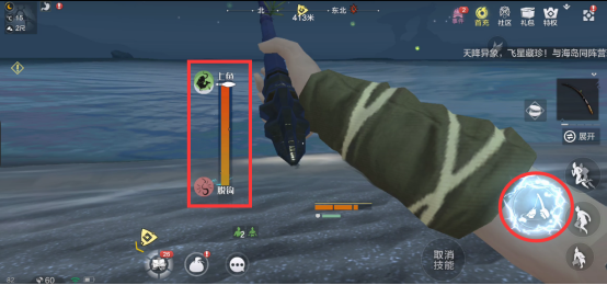 如果鱼上钩了,会出现如下图的界面,此时你需要快速点击右边的按钮,直到把鱼拉上来,否则它就会挣脱鱼竿。