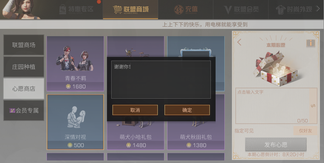 在拱廊街心愿商店选择任意礼物,留下留言后发布心愿,即可成功设置一次心愿。