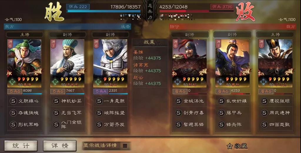 该阵容能获得阵营加成和天水之战16点武力的缘分加成,主将姜维担任主要输出,赵云担当输出补充(偶有赵云伤害超过姜维的奇观)而诸葛亮则作为减伤、和阻止敌方战法施放,以及为姜维提供先攻的工具人。