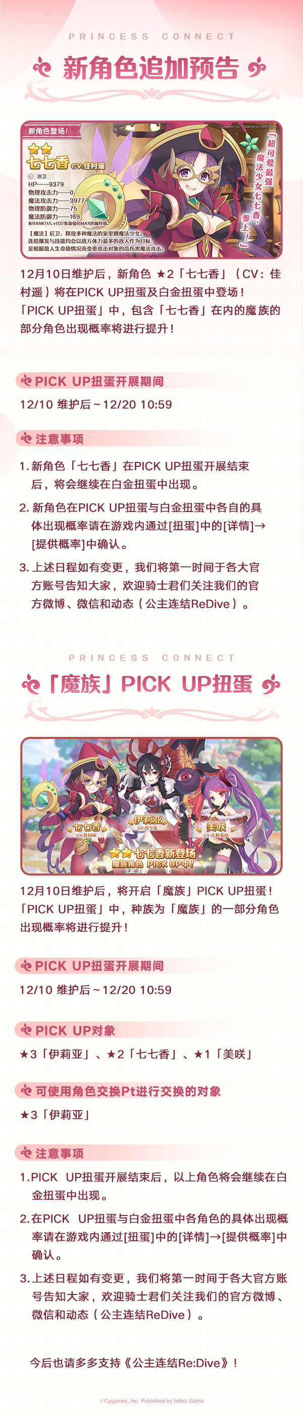 维护完成后,全新角色★2「七七香」(CV:佳村遥)即将登场!游戏内将同时开启「魔族」 PICK UP扭蛋活动。