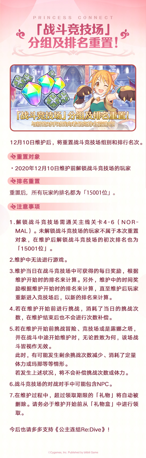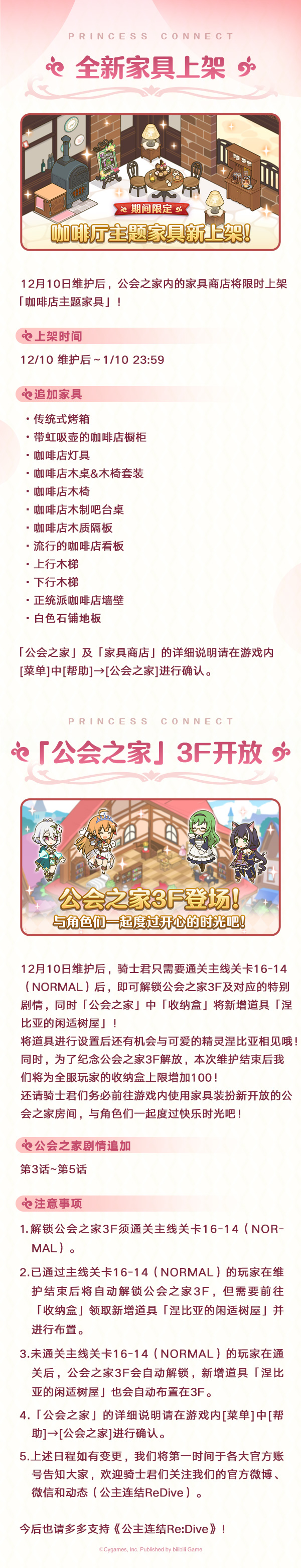 同时,还将追加新家具,开放公会之家3F,并对战斗竞技场的排名及奖励进行重置!