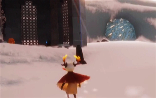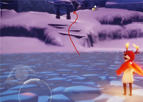 第一步:来到冰湖中心,穿过下图所示的石门。