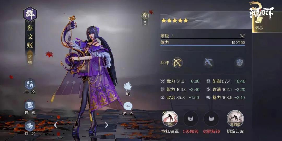 蔡文姬是目前唯一一个自带恢复效果的速度型辅助,如果给她配上固本培元和破虏等武技,那么她能提供全方位的队伍减伤,收益非常巨大。