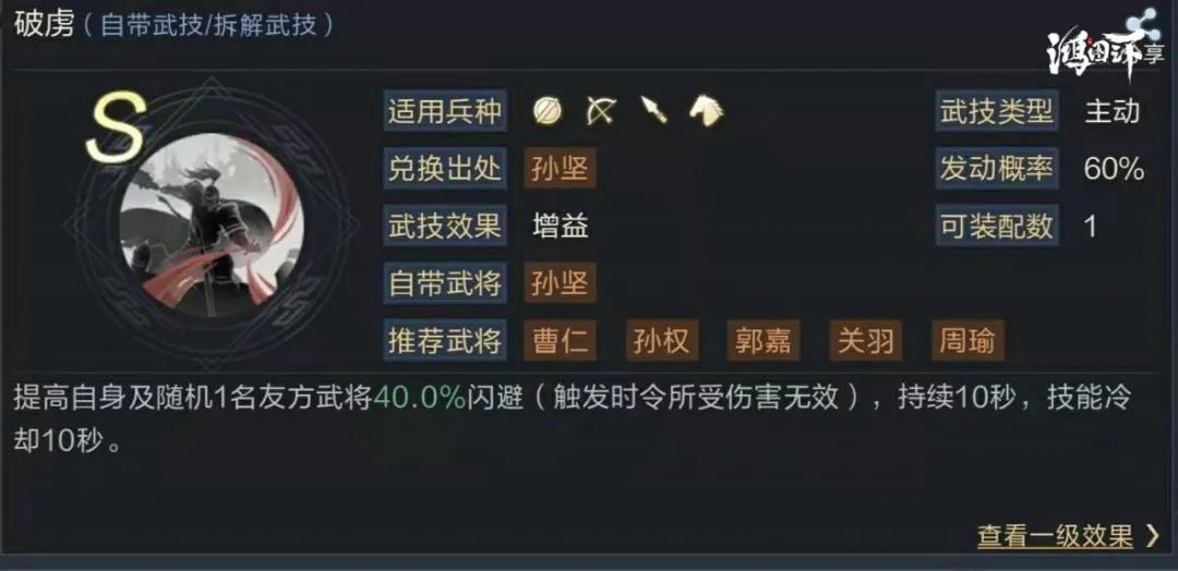 提高自身及随机1名友方武将40%闪避,持续10秒,10秒CD。可以有效提高我方生存概率,大大降低承受伤害。