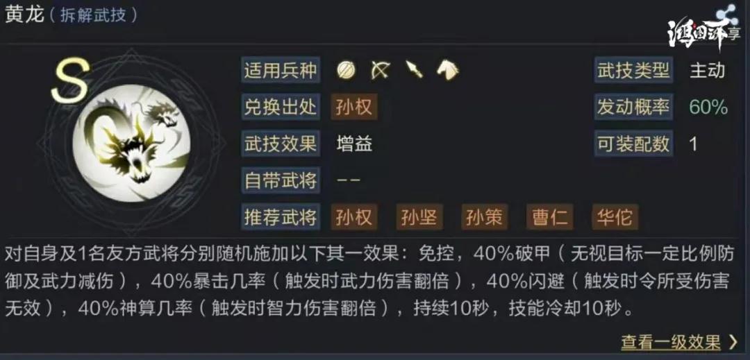 对自身及1名友方武将随机施加免控、40%破甲、40%暴击概率、40%闪避、40%神算几率,持续10秒,10秒CD。虽然该武技存在一定的随机性,对各种不同队伍来说,只会存在一个相对无效的增益,但其它效果无论出现哪一种都是实打实的增益效果。