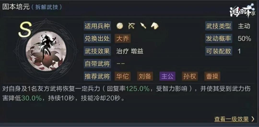 对自身及1名友方武将恢复一定兵力,并使其受到武力伤害降低30%,持续10秒,20秒CD。能够恢复我方武将兵力并提供武力减伤,给前排武将佩戴可以有效增加队伍续航能力。
