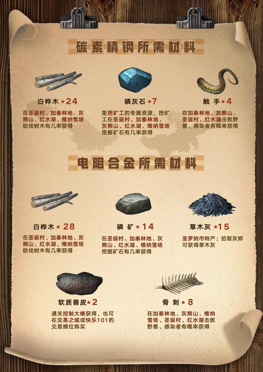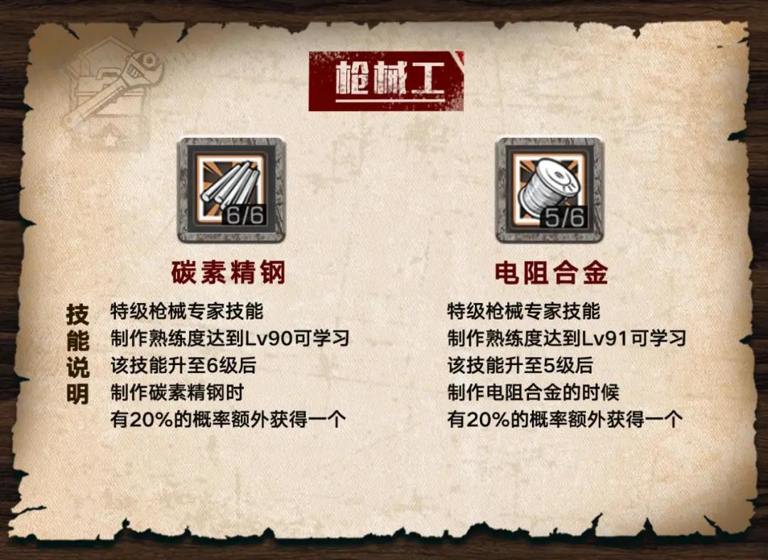 枪械工两个新技能,可以让幸存者在制作碳素精钢和电阻合金时,额外获得一个材料。