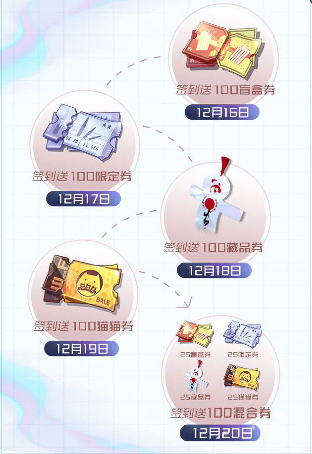 在2020年12月16日一2020年12月20日期间,登陆黑潮之上,多种奖券无须做任务,签到即领,共500抽等你全带走!