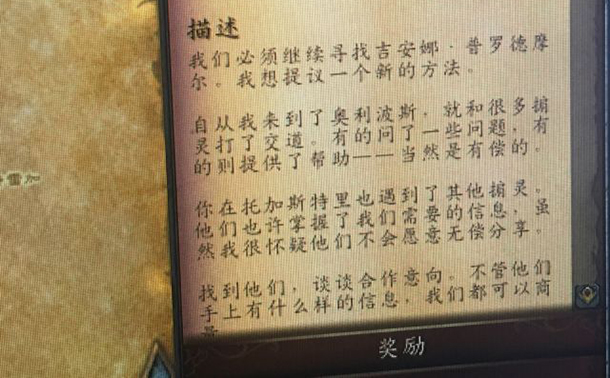 我们必须继续寻找吉安娜·普罗德摩尔。我想提议一个新的方法。 自从我来到了奥利波斯,就和很多掮灵打了交道。有的问了一些问题,有的则提供了帮助——当然是有偿的。 你在托加斯特里也遇到了其他掮灵。他们也许掌握了我们需要的信息,虽然我很怀疑他们不会愿意无偿分享。 找到他们,谈谈合作意向。不管他们手上有什么样的信息,我们都可以商量。