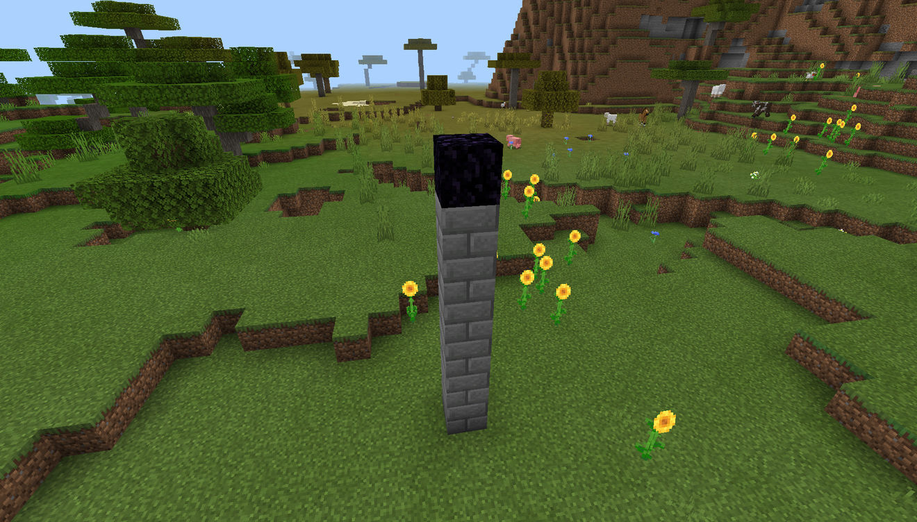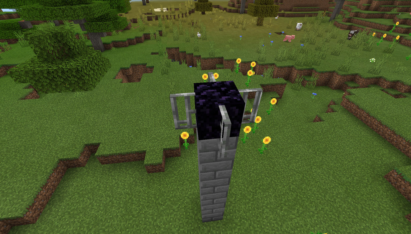 在黑曜石的四个面放上铁栅栏,铁栅栏上放置圆石墙。