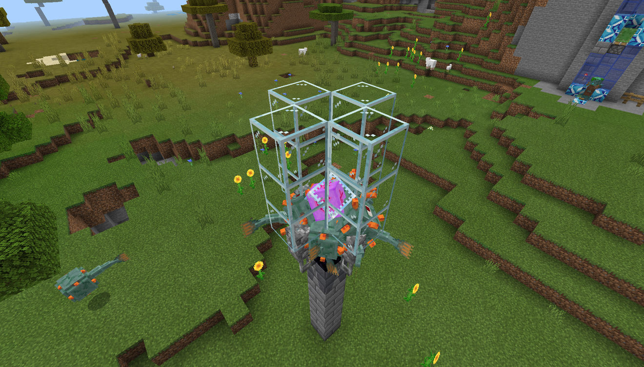 最后用命名牌给这些守卫者命名,然后输入指令/effect @e[name=ABC] invisibility 1000000,这样守卫者就会隐身很长一段时间,也就大概两百多个小时吧。做完这些,守卫塔就做好了。