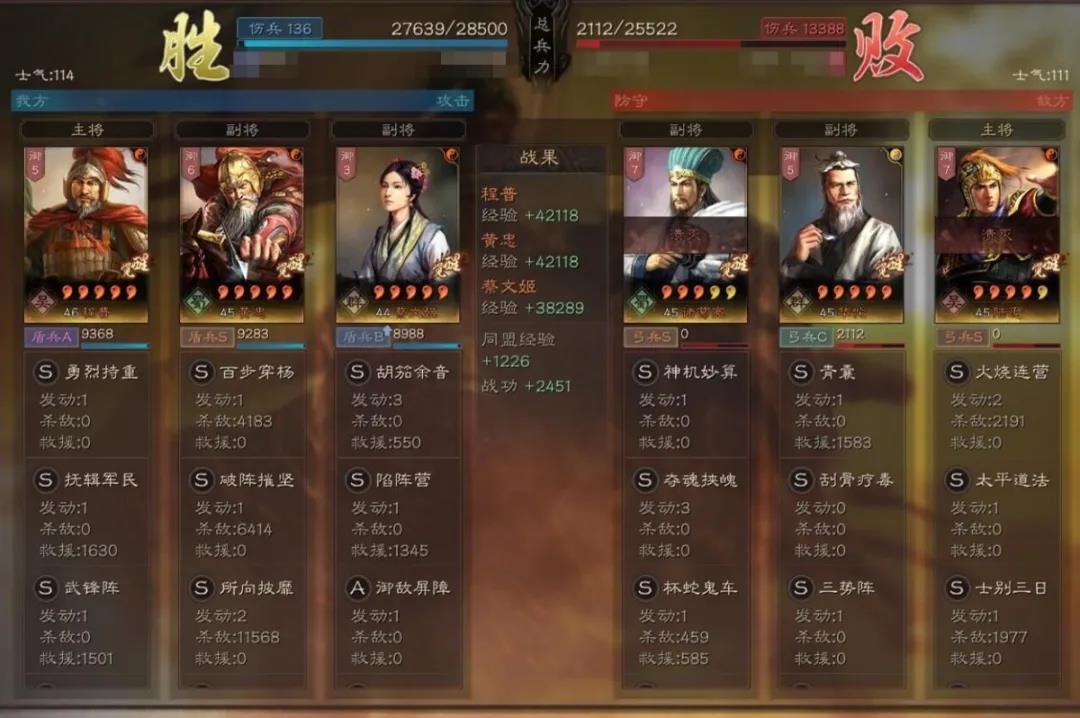 依靠高减伤高回复把回合拖住,给黄忠创造输出环境,很多人会说黄忠稍微一演这个队伍就没输出了,但经过100场左右的实战来看完全靠谱的,这里我们给到黄忠的正常期望是自带百步穿杨场均触发一次,破阵摧坚场均二次,所向披靡场均一次。实战中只要三个战法有二个战法达到我们的正常期望那就是非常赚了。