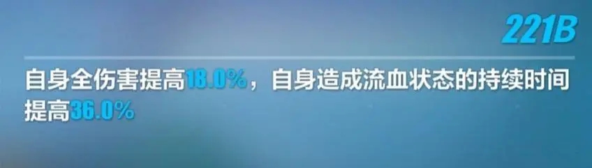 首先是自身的全伤害提升效果,数值一般;其次是延长自身造成流血BUFF的时间,目前来看可以触发这条效果的角色不多,其中能塞进现有成熟物理阵容的角色更是几乎没有,只能期待未来可能出现的流血特性角色了。