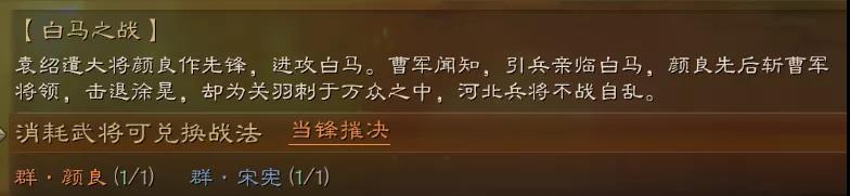 事件战法,通过白马之战事件兑换。需要消耗武将:5星颜良,3星宋宪。