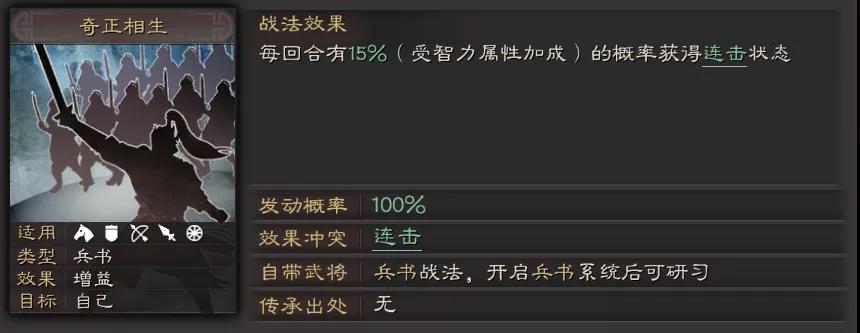 (2)满级基础值为182%,受智力影响。在所有谋略型突击战法中伤害最高。可即便如此,这个数值也与【兵无常势】差了近60%。常见学习武将有,太史慈、郭嘉、诸葛亮,还有部分兵书里有奇正相生的智力武将。