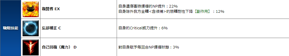 1.复仇者 EX:自身遭受伤害时获得的NP提升(22%);自身除外我方全体含候补的弱体耐性下降(12%)【副作用】