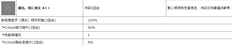 付与自身:〔源式〕特攻100%(3回合);暴击威力提升50%(3回合);NP获取(未知);出星(未知)。