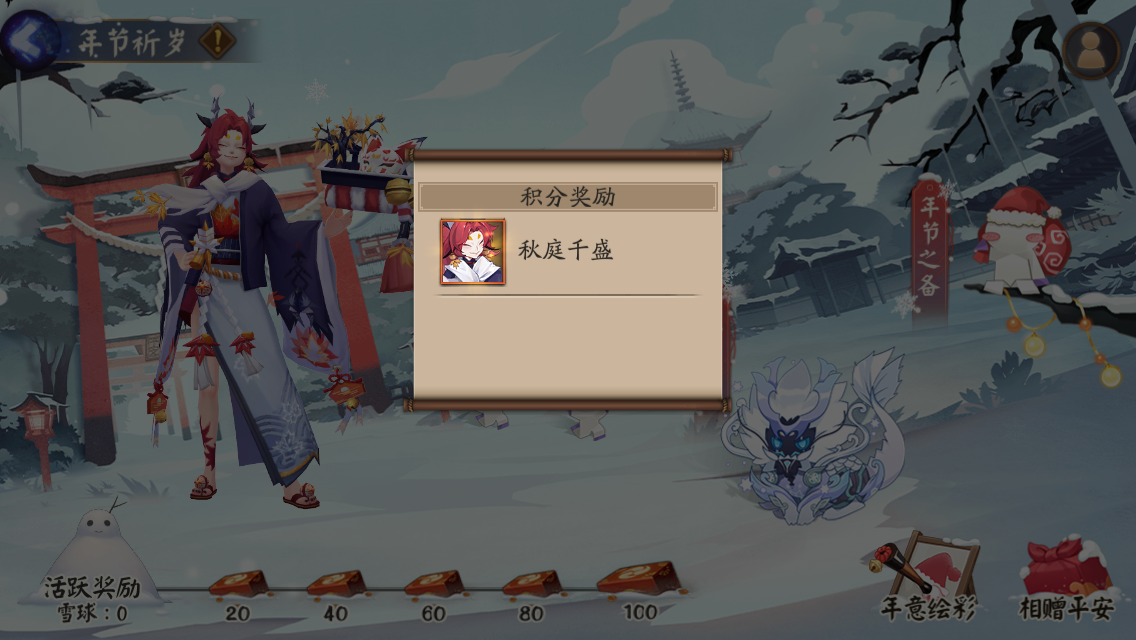 活动期间,大人们参加年节祈岁活动,即可获得活动道具雪球。累积指定数量的雪球,即可获得插画券、神秘的符咒、皮肤券、活动专属动态头像框年节祈岁和星熊童子皮肤秋庭千盛。