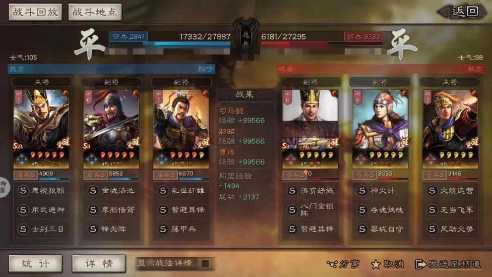 3)草船借箭依赖统率加成,根据敌方输出回复血量,与旧司马盾三人适配性好。曹操、郝昭均可以加点统率,郝昭由于战法搭配的问题,自身兵刃减免在前4回合并不能达到曹操和司马懿的90%减免,是旧司马盾的弱点所在,面对过于暴躁的三势吕布,前期若被决斗至死,司马盾将一击即溃。所以可以选择郝昭多点统率,配合草船借箭来避免该情况的发生。