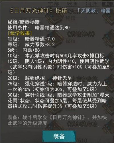 日月万光神针20级解锁绝招,自身附带多种词条,可以给其他暗器做辅助,攻击时有概率附加流血,可以考虑做流血套路。