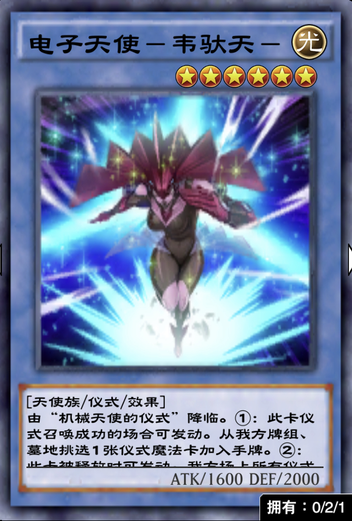 电子天使卡组必备卡,曾经电子活动才能获得的卡,明日香升级仅给一张。因此想玩电子天使文艺复兴的话墙裂建议兑换!检索仪式,做仪式素材释放有对仪式怪加攻效果,电子天使牌组核心之一。
