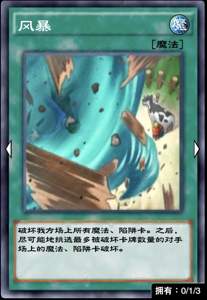 一张X换X的破后场魔法,效果类似一速的二重旋风。尽管在多数主流卡组中不投入使用,但是在近期的大型比赛中,一些咒眼卡组会投入此卡来破坏自己的场地/装备以触发遗言等效果。抽新大包的萌新如果想玩咒眼又不想去买二重旋风的话可以用这张卡过渡。