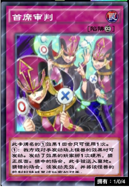 曾经出的活动卡之一,仅KC等大型活动券才能兑换。赌狗的快乐源泉,在枪龙等卡组中均有投入使用。赌对了血赚,无效对面怪的发动效果还能白赚一张怪;赌不对了也能让对面在决定自己命运的过程中吓尿。反正这张卡是稳赚不赔的。需要注意的是,此卡发动后是对手猜正反掷硬币,因此自己斋王的技能是不会影响到投币结果的(除非对面斋王带的也是硬币技能)。