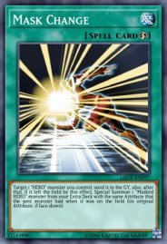 效果:①:以自己场上1只「 英雄 」怪兽为对象才能发动。那只怪兽送去墓地,和那只怪兽相同属性的1只「 假面英雄 」怪兽从额外卡组特殊召唤。