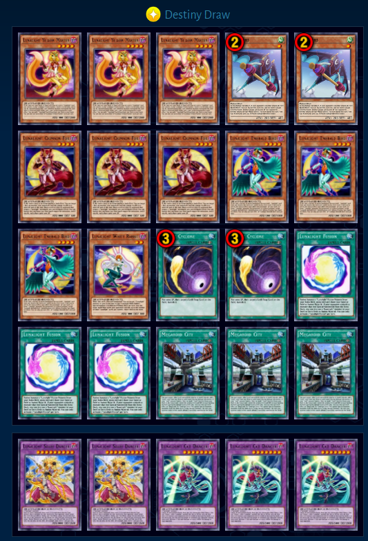 卡组方面,投入月光本家和新宇侠的配件,剩下就是一些辅助卡,技能毅力防止被otk。新宇月光目前是靠着新宇侠的辅助展开,然后运用本家资源进行otk突击的卡组。打法简单暴力。组法也是通俗易懂。龙魔导用来检索融合,新宇侠融合因为可以卡组融合,能够触发月光怪兽的效果。进行一系列的后续操作。这卡组真的是比较强势,简单做到的otk。不怕风筝机人,避免一些遗言效果。出了大姐能单刷想当一部分的黑魔导和青眼这样的卡组。