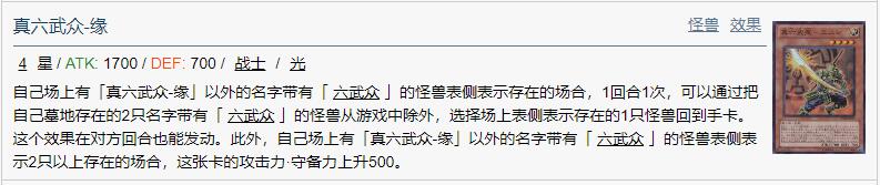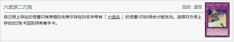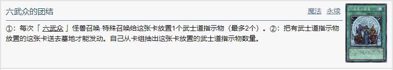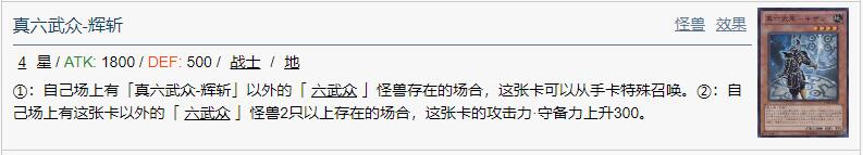 六武众核心怪兽,场上有除自己名字以外的六武众就能从手牌特招此卡。必满3。