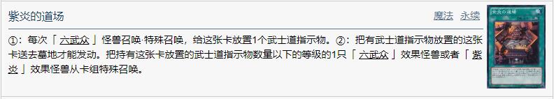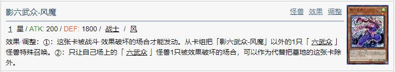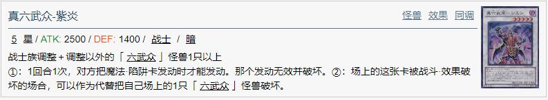六武众核心卡,是同调真紫炎的主要协调。自身带破坏后检索卡组六武众并特招,效果2还能帮场上的本家挡刀。