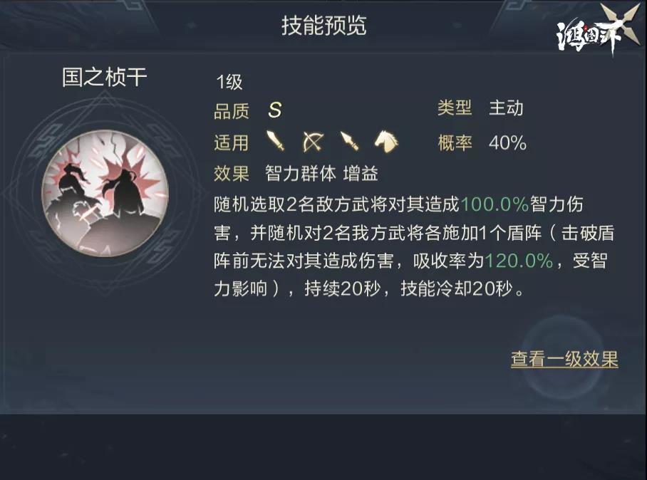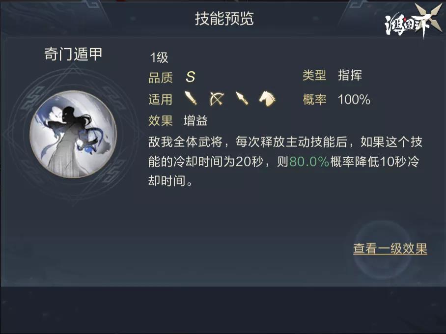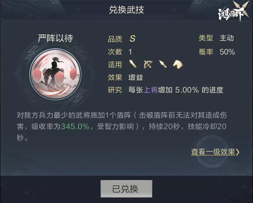 2号武技推荐严阵以待,可为己方兵力最低的武将施加一个高额盾阵,持续时间与冷却时间相同,通过左慈的减CD效果能让该武技快速刷新,配合厚德载物大幅提高单核存活率。