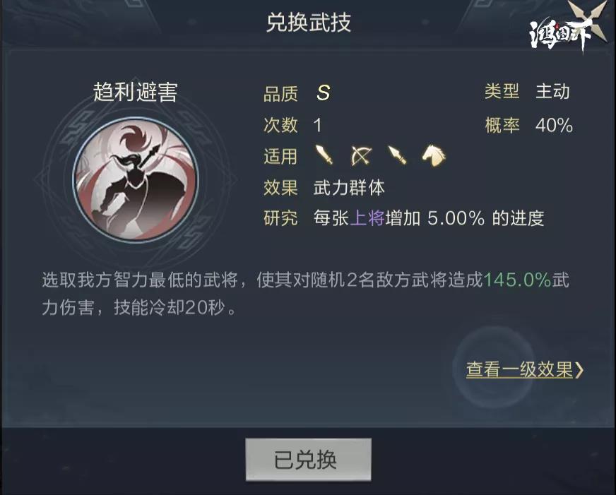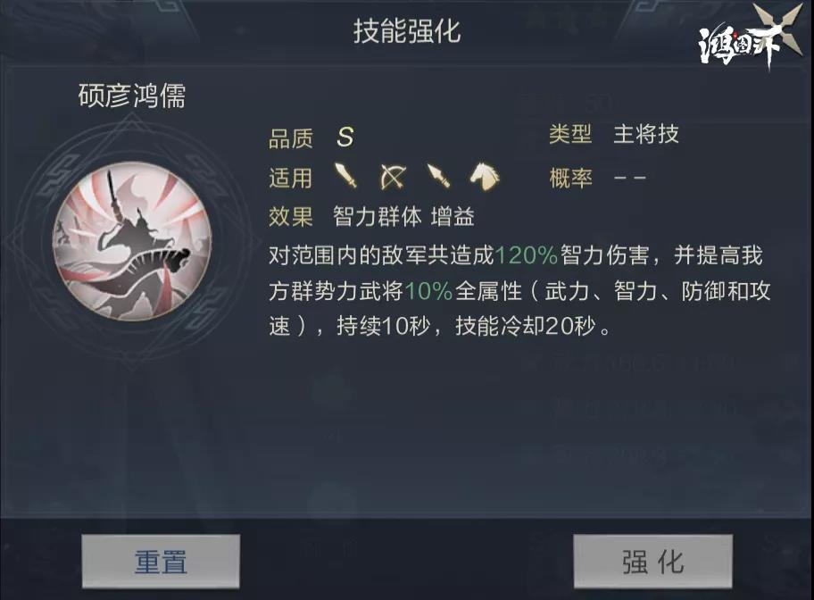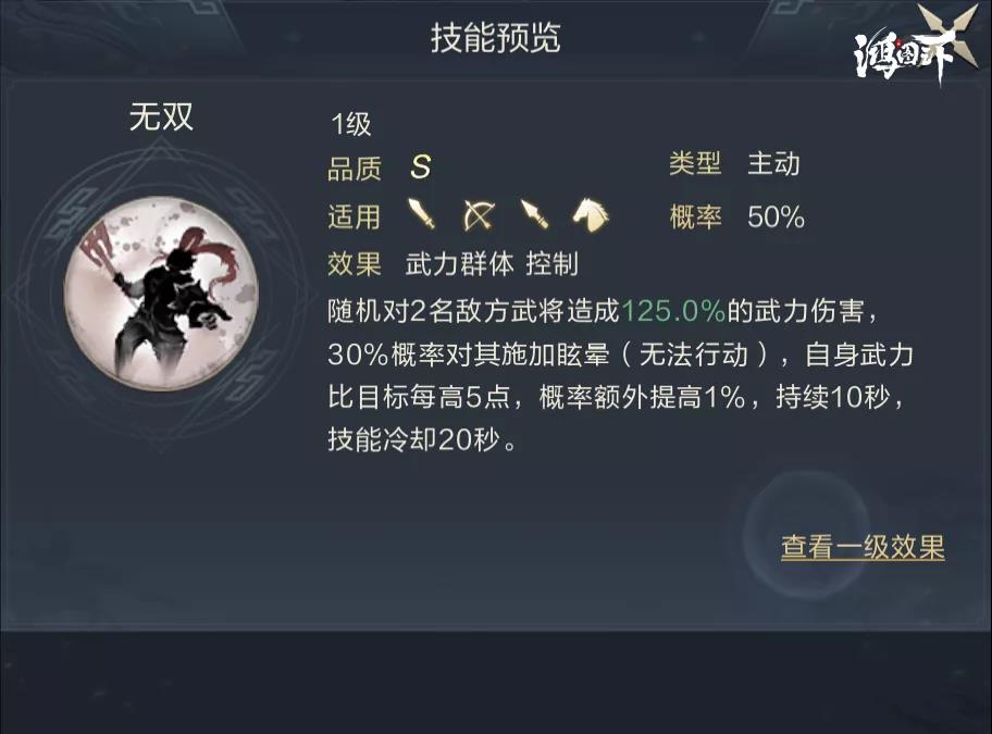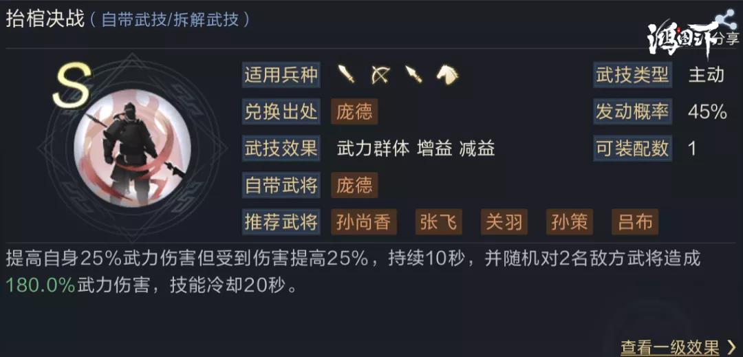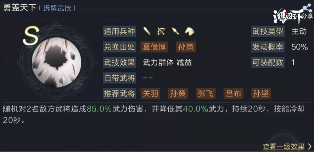 2号武技推荐勇盖天下,该武技虽然伤害较低,但40%的武力属性削减非常强力,持续时间长达20秒。通过左慈的减CD效果能让这个减益效果长时间生效,是对抗武力队非常实用的武技。