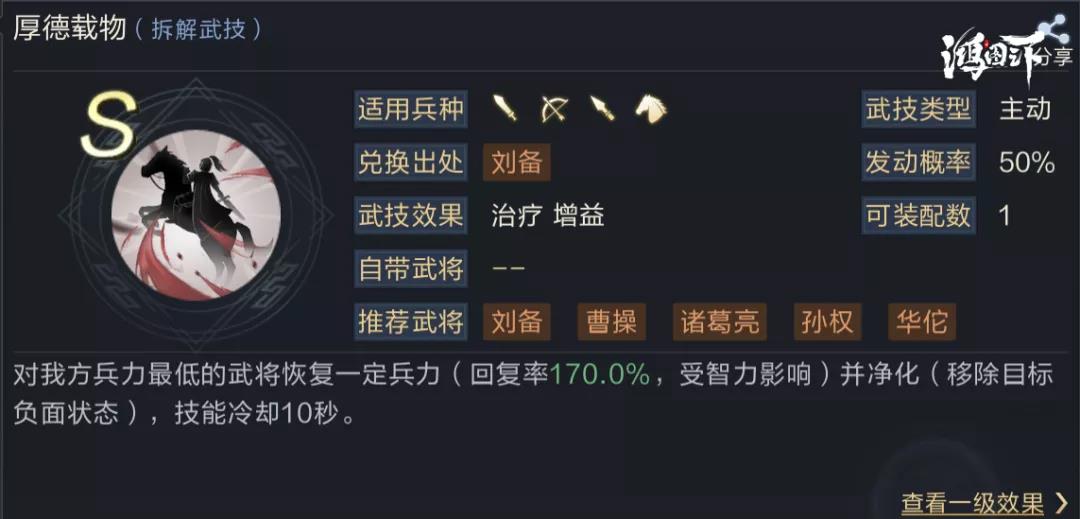 1号武技推荐厚德载物,能为兵力最低的角色恢复较多兵力,并净化负面状态,搭配盾阵的保护效果能让战斗中处于危险的队友得到续航,并且提供净化。