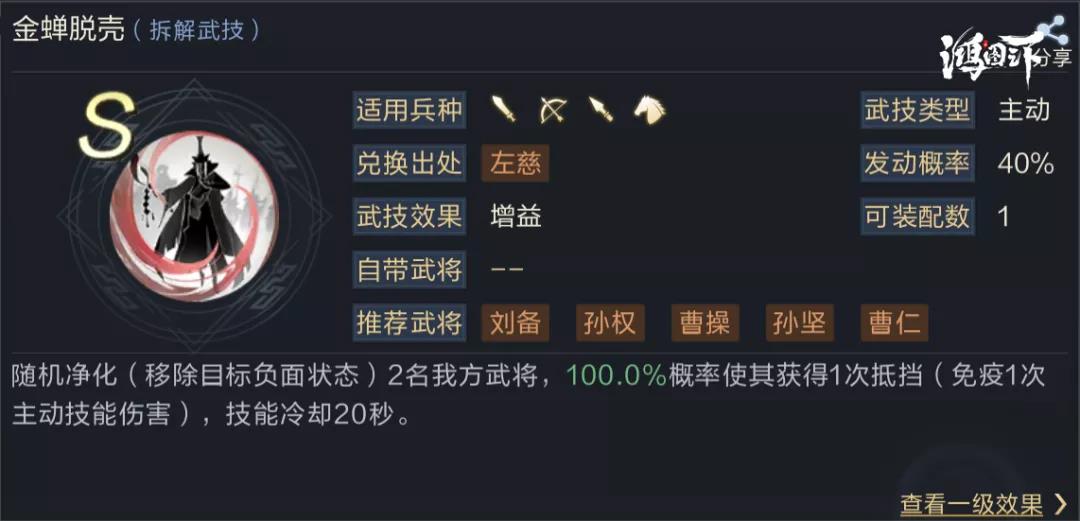 1号武技推荐金蝉脱壳,该武技可随机净化2名我方武将,并且提供1次抵挡。一方面可提高队伍中净化目标的容错率,另一方面可提供不错的保护能力,配合减CD效果在实战中非常强,只要发动成功几乎可以全程免疫敌人的主动技能伤害。