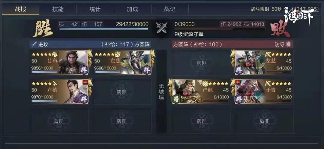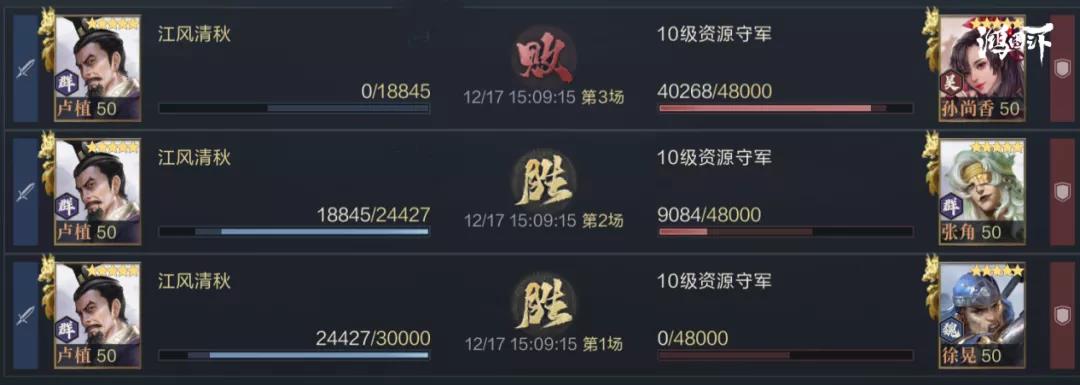 经过十级地测试可以看出,在站位无劣势的情况下,该阵容能以较低的战损获得胜利,正常情况可以打掉两队10级地守军,打9级地时战损甚至只有几百而已。如果想将盾阵套路用于对战的话,建议大家换上张飞、赵云等武将,他们拥有更强的单核输出能力。