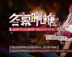 2020年12月25日00:00~2021年1月14日23:59期间完成期间特殊任务,可以获取密码卡,进行数字连线后将获得丰富奖励,其中包括汉阳造88式圣诞装扮女仆团的狂飙午夜!本套装扮还将搭载Live2D功能,快与她一同前往雪夜的极速之旅吧!