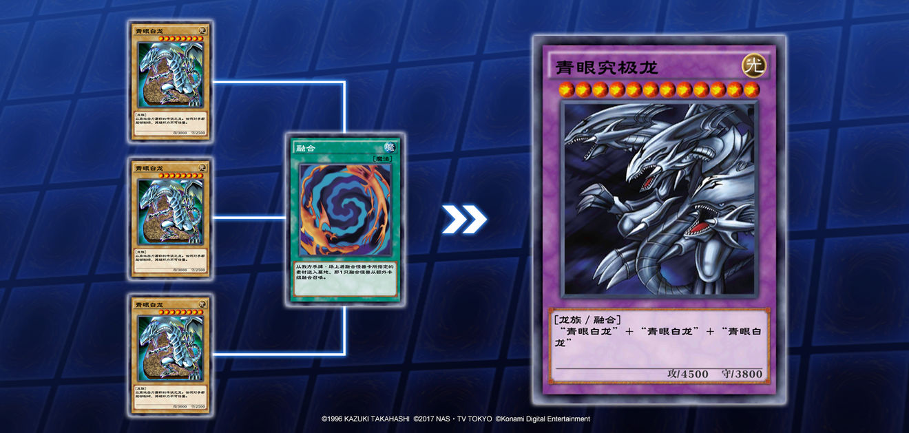 以融合怪兽青眼究极龙为例,它所需的融合素材为3只青眼白龙。当自己场上和手牌集齐3只青眼白龙时,发动融合魔法卡,将集齐的3只青眼白龙送去墓地,即可将青眼究极龙从额外卡组特殊召唤到场上。