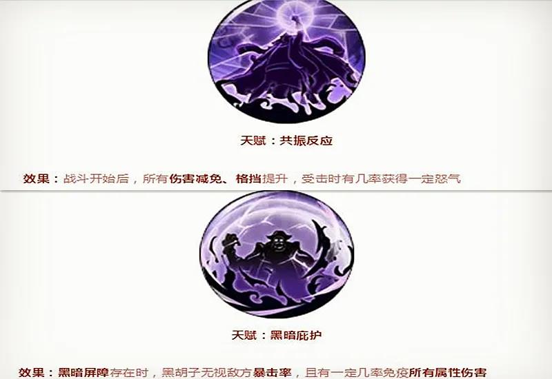 天赋黑暗庇护:黑暗屏障存在时,黑胡子无视敌方暴击率,有一定几率免疫所有属伤。