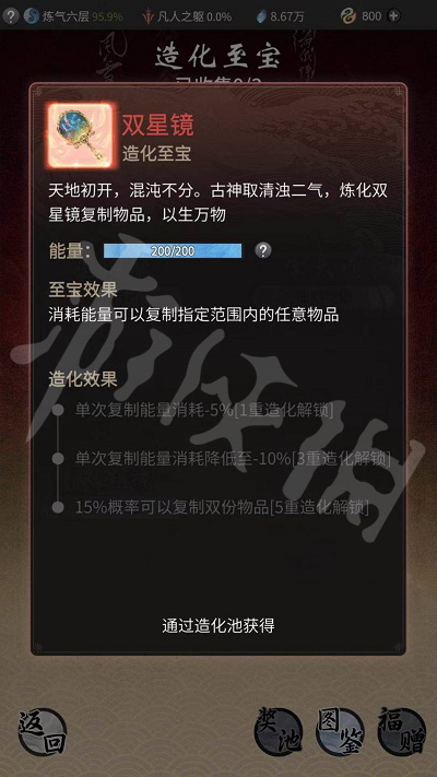 造化至宝目前只能通过消耗造化图在造化池中获得,只有0.25%的概率抽到。