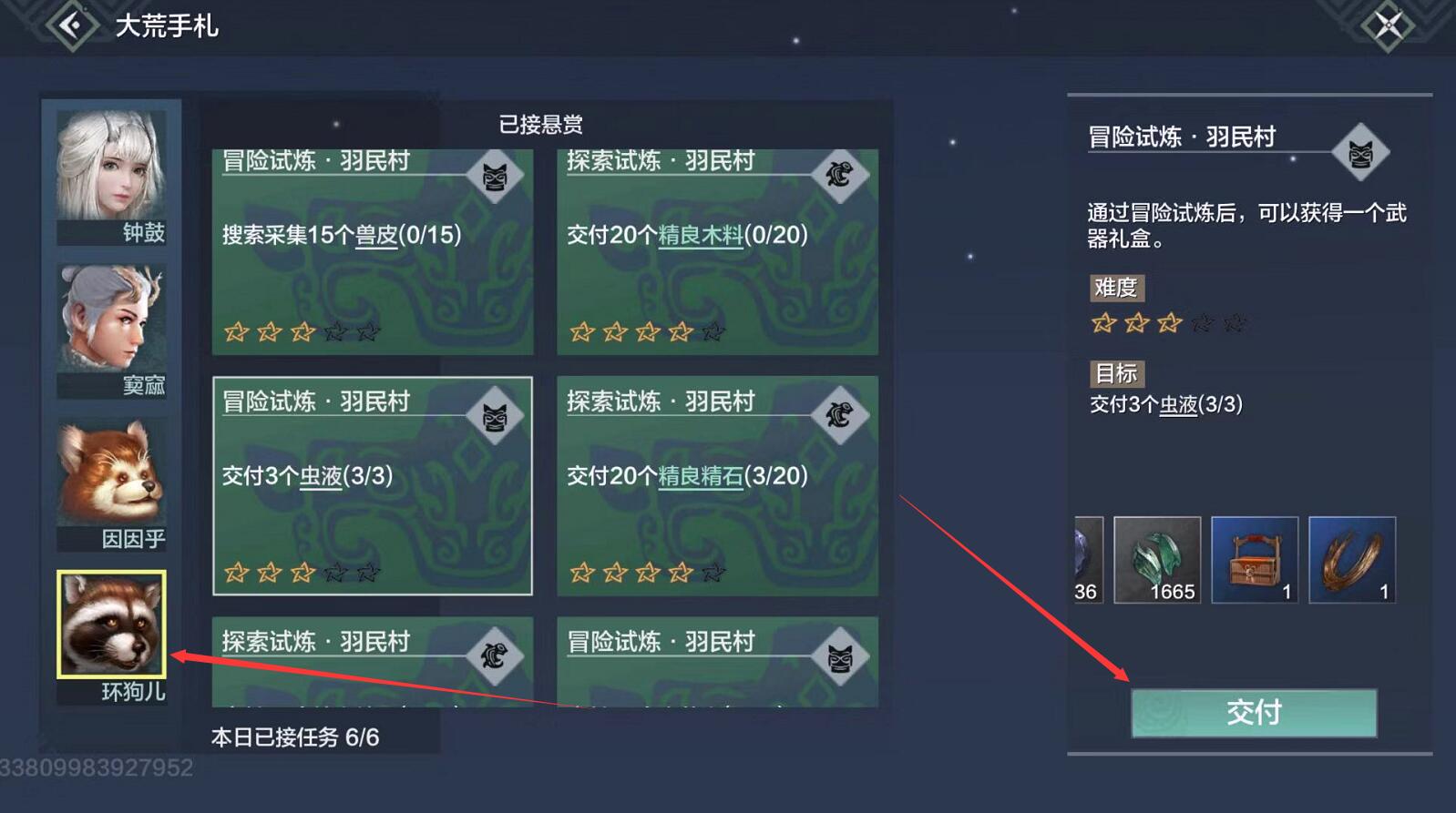 3.在大荒手札界面点击最下方的环狗儿可以交付任务。