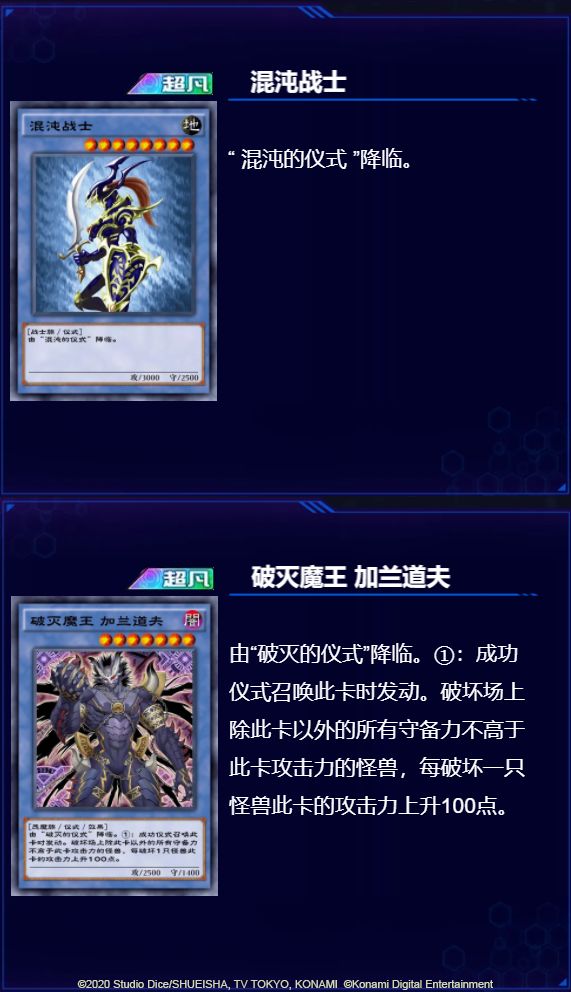 该卡盒收录了「混沌战士」「破灭魔王 加兰道夫 」等超强的仪式怪兽。使用暗游戏召唤「混沌战士」,可以看到气势十足的3D召唤动画!