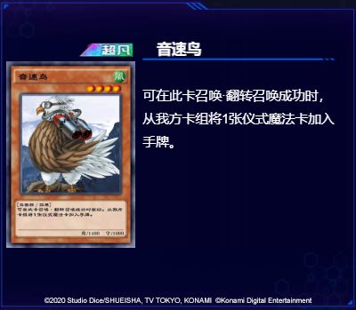 召唤仪式怪兽需要对应的仪式魔法卡,「音速鸟」可以将卡组的仪式魔法加入手牌;