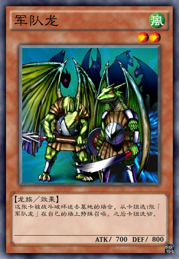 效果:这张卡被战斗破坏送去墓地时,从自己卡组把1只「军队龙」特殊召唤。