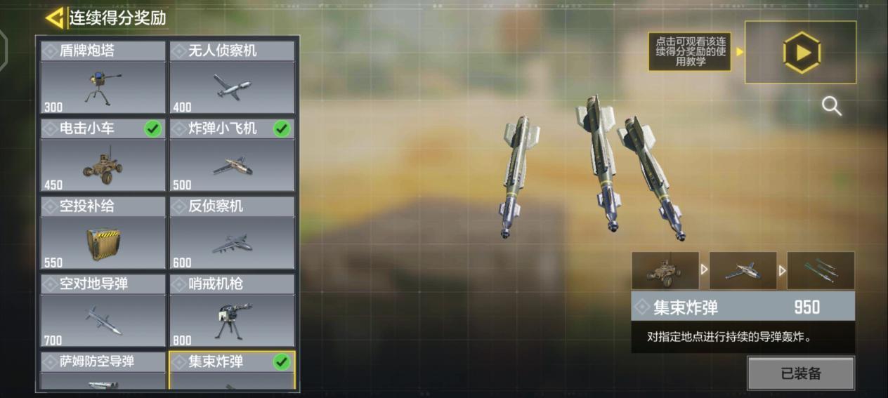 因为该模式节奏较快,连续得分奖励选择两个低分的炸弹小飞机、电击小车能频繁的帮助到你占据优势,同时带上一个集束炸弹,能够持续到压制固定片区的敌人,帮你取胜。