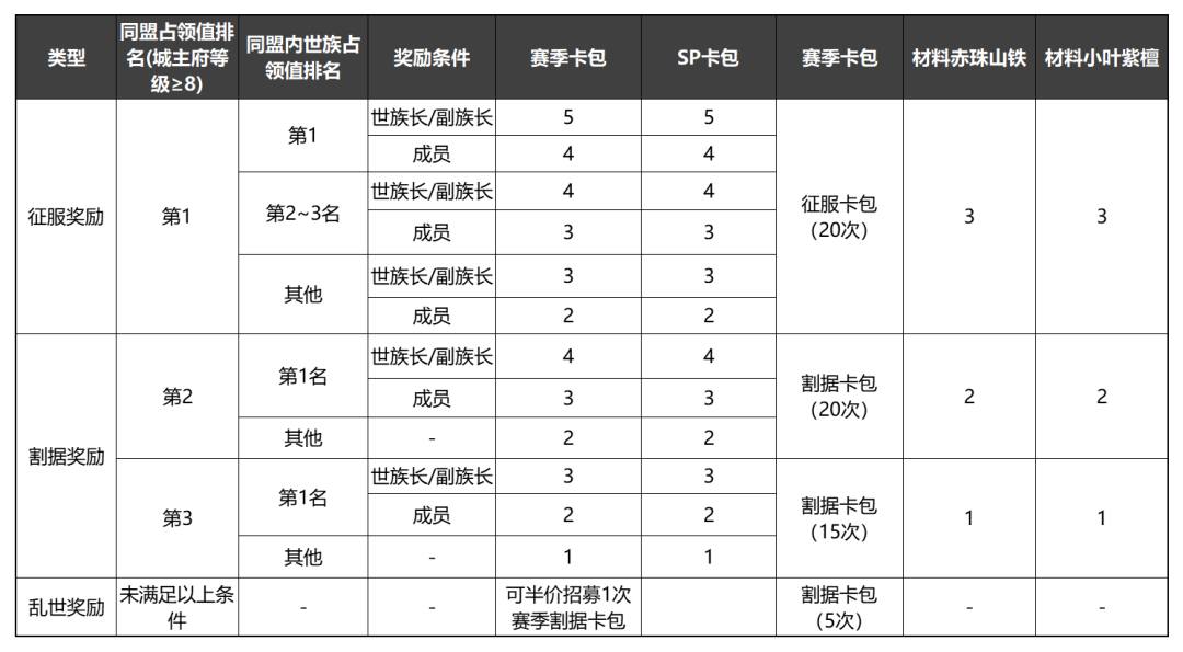 本赛季中,各个世族结成同盟竞逐天下。赛季结算时将根据各个同盟的占领值来进行最终奖励的结算。同盟之间排名决定征服、割据及乱世的奖励名次,同盟内部的各个世族同样以世族所获得的占领值进行排名,决定细分的奖励档次。