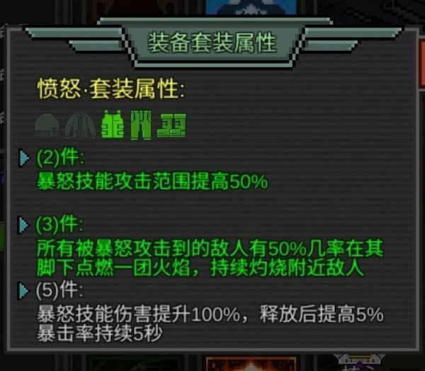 配合愤怒技能使用的套装,比较适合出两件,在一些怪密集近身时,有清屏效果。